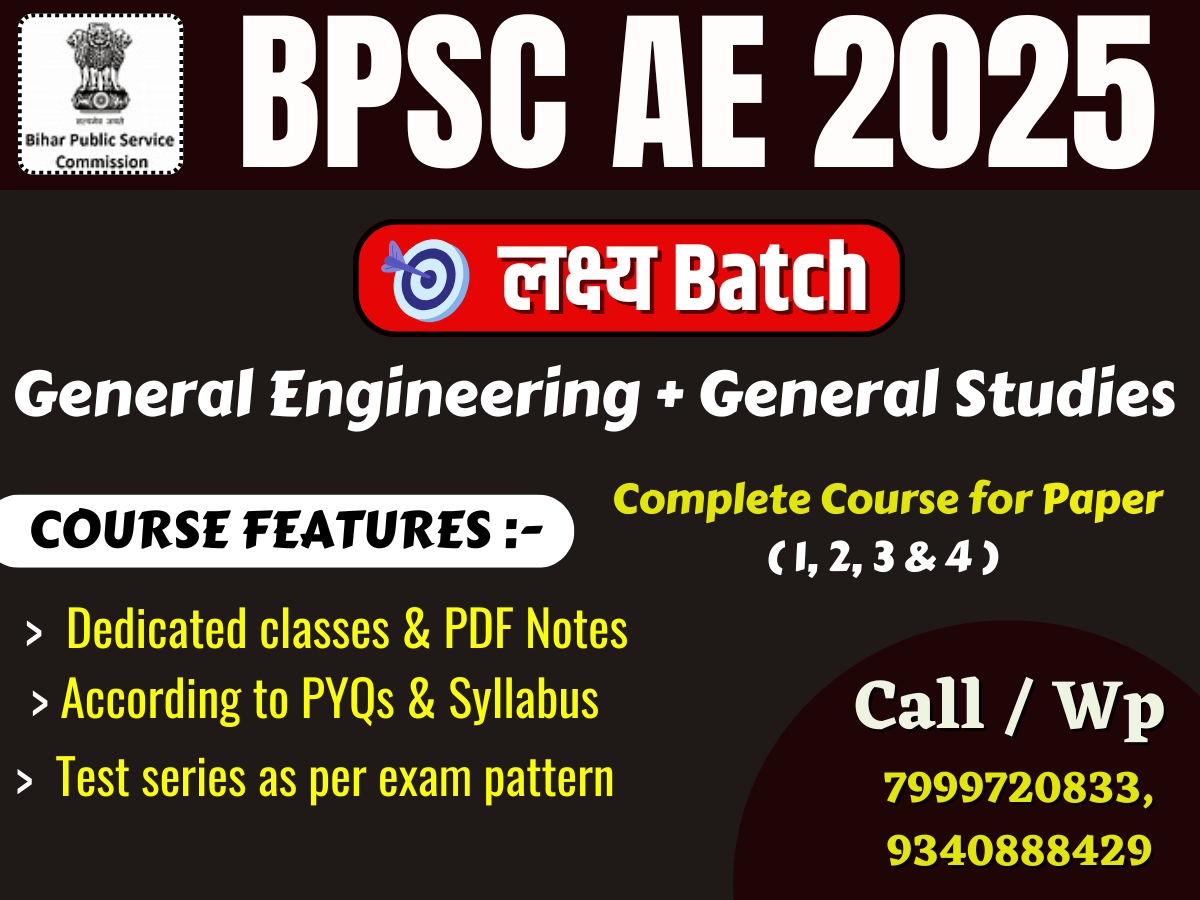BPSC AE - 2025 | Complete Course ( For Paper 1, 2, 3 & 4) 🔹 Course Features: 📚 All Subjects Live & Recorded Video Lectures. 📝 Question Practice During Classes 🗒️ Comprehensive Notes 📊 Test Series ❓ Full Doubt Support For Any Query, Call 📞: 9340888429, 7999720833